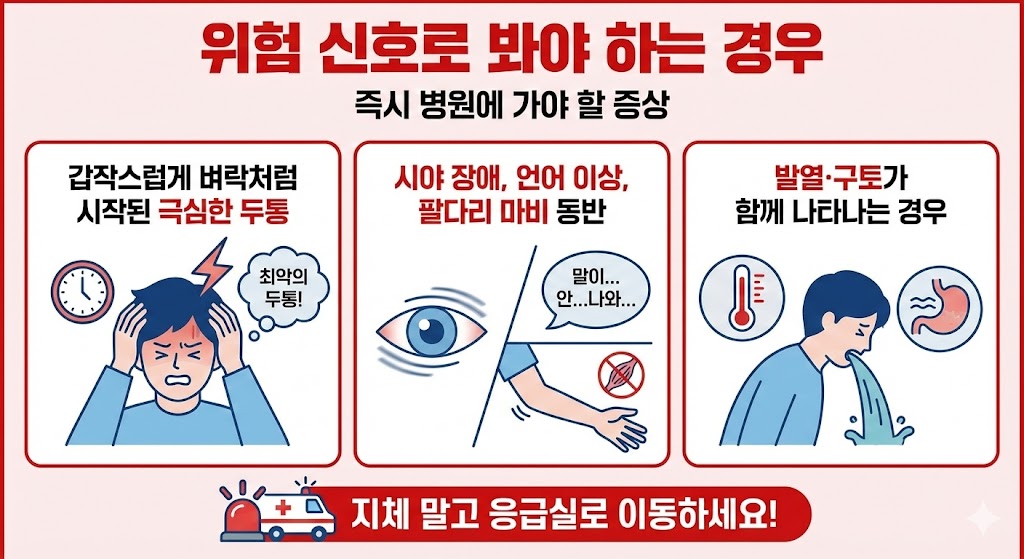 두통이 지속되면 단순한 피로나 스트레스가 아니라 우리 몸이 보내는 중요한 신호일 수 있습니다. 일시적인 통증은 휴식으로 호전되기도 하지만, 며칠 이상 반복되거나 강도가 점점 심해진다면 원인을 반드시 점검해야 합니다.