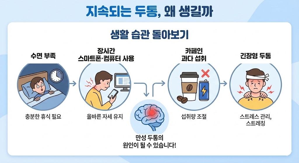 두통이 지속되면 가장 먼저 생활 습관을 돌아볼 필요가 있습니다. 수면 부족, 장시간 스마트폰·컴퓨터 사용, 카페인 과다 섭취는 대표적인 원인입니다. 특히 목과 어깨 근육 긴장이 오래 유지되면 긴장형 두통으로 이어지기 쉽습니다.