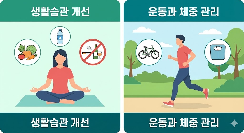 - 카페인, 알코올, 흡연을 줄이고 규칙적인 식사와 수면을 유지합니다.
