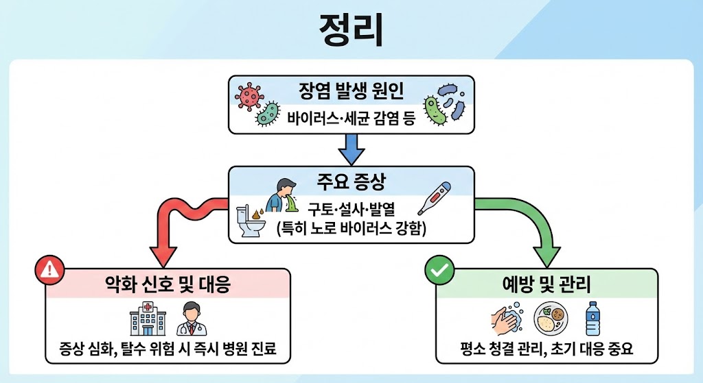 장염증상은 바이러스·세균 감염 등 다양한 요인으로 발생하며, 특히 노로 바이러스는 구토·설사·발열 같은 급 장염 증상을 강하게 일으킵니다. 증상이 갑작스럽게 심해지거나 탈수 위험이 보인다면 반드시 빠르게 병원 진료를 받아야 합니다. 평소 청결 관리와 조기 대응이 가장 효과적인 예방법입니다.