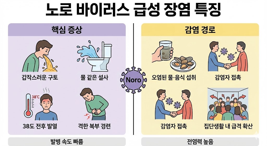 겨울철 장염의 절반 이상은 노로 바이러스가 원인입니다. 발병 속도가 매우 빠르고 전염력이 높아 가족 간 감염도 쉽게 일어납니다.